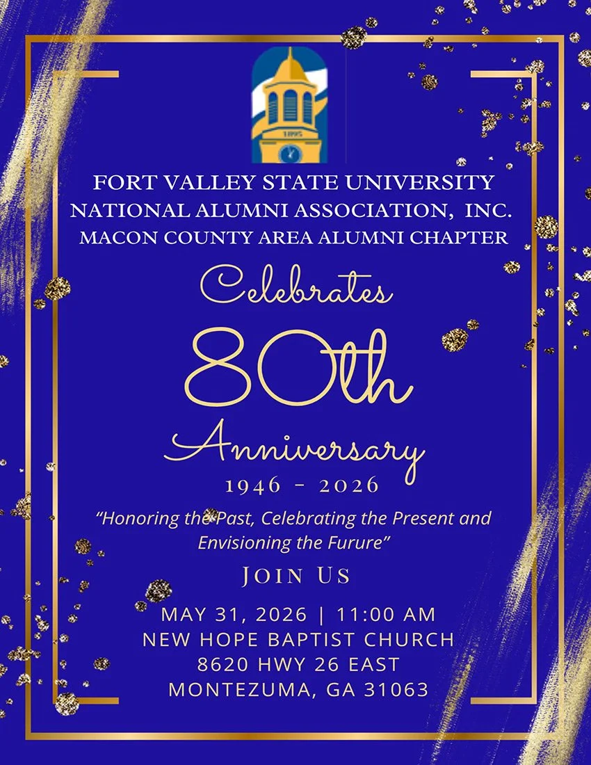 Join the FVSU National Alumni Association, Inc. Macon County Area Alumni Chapter in celebrating 80 years of service and commitment to the Association and Fort Valley State University. On Sunday, May 31st at 11 AM at New Hope Baptist Church, Montezuma, GA, will be "Honoring the Past, Celebrating the Present and Envisioning the Present".